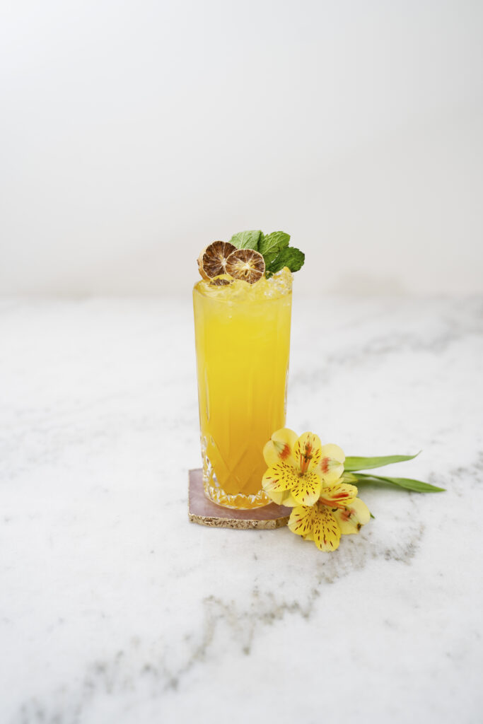 En livlig og farverig drink med en perfekt balance mellem sødme og syrlighed, toppet med et strejf af frisk mynte for en ekstra frisk oplevelse.